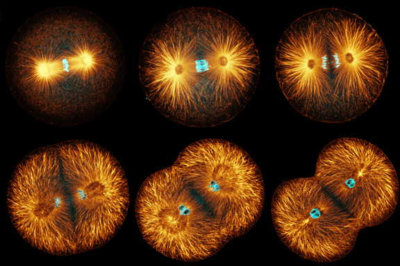 Sand dollar zygotes during first mitosis, fixed and stained for microtubules and chromosomes (single confocal sections). Top row: metaphase, early anaphase, late anaphase; bottom row: successive stages in furrowing. A variety of experiments imply that microtubules stimulate cortical contractility in the cell equator, but also many experiments purport to show that microtubules are dispensable after mid-anaphase (right-most frame in the top row). In an urchin egg like this one, microtubules have reached the cell poles at this stage, but not the equator. They only reach the equator after furrow initiation (left frame, bottom row). How can this be?