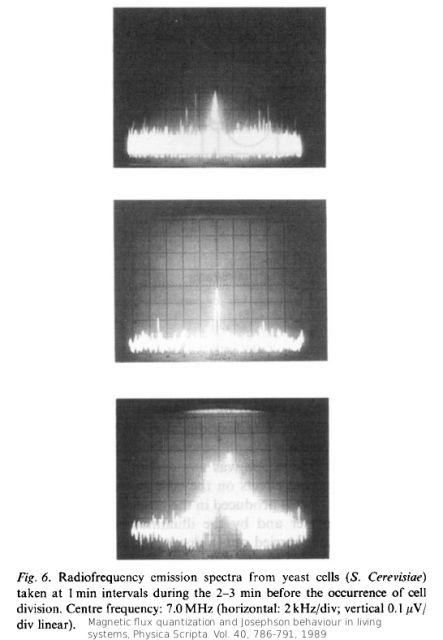 Radiofrequency emission spectra from yeast cells in Mitosis, taken from the paper Magnetic flux quantization and Josephson behaviour in living systems, Physica Scripta. Vol. 40, 786-791, 1989 (page 790).